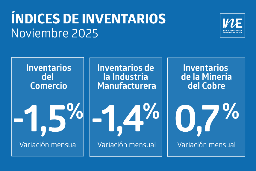 Los resultados completos de los Índices de Inventarios del Comercio, de la Industria Manufacturera y de la Minería del Cobre, correspondientes a noviembre de 2025 están disponibles en www.ine.gob.cl.