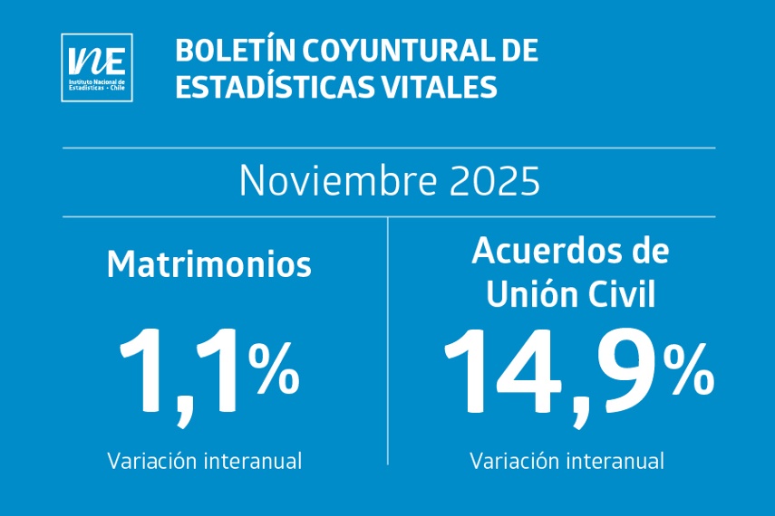 En noviembre de 2025, los Acuerdos de Unión Civil (AUC) ascendieron a 1.673, lo cual representó un alza de 14,9% respecto de la cifra observada para el mismo mes de 2024, según se desprende del Boletín Coyuntural de Estadísticas Vitales, publicado por el Instituto Nacional de Estadísticas (INE).