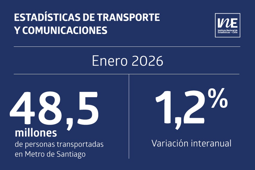 Un total de 48,5 millones de personas transportadas contabilizó la empresa Metro de Santiago en enero de 2026, cifra que significó una variación interanual de 1,2%, de acuerdo con el Boletín de Transporte y Comunicaciones del Instituto Nacional de Estadísticas (INE), publicado esta mañana.
