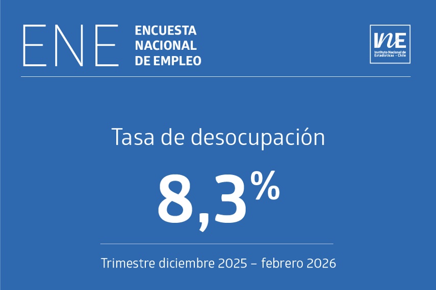 En 8,3% se ubicó la tasa de desocupación en Chile durante el trimestre diciembre de 2025 – febrero de 2026 (DEF 2026), de acuerdo con la información entregada por la Encuesta Nacional de Empleo (ENE), elaborada por el Instituto Nacional de Estadísticas de Chile (INE).