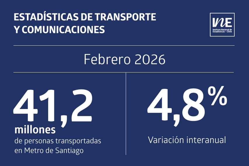 Un total de 41,2 millones de personas transportadas contabilizó la empresa Metro de Santiago en febrero de 2026, cifra que significó una variación interanual de 4,8%, de acuerdo con el Boletín de Transporte y Comunicaciones del Instituto Nacional de Estadísticas (INE), publicado esta mañana.