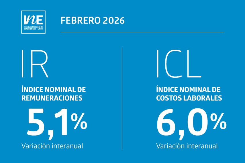 En febrero de 2026, los Índices Nominales de Remuneraciones (IR) y de Costos Laborales (ICL) registraron alzas en doce meses de 5,1% y 6,0%, respectivamente.